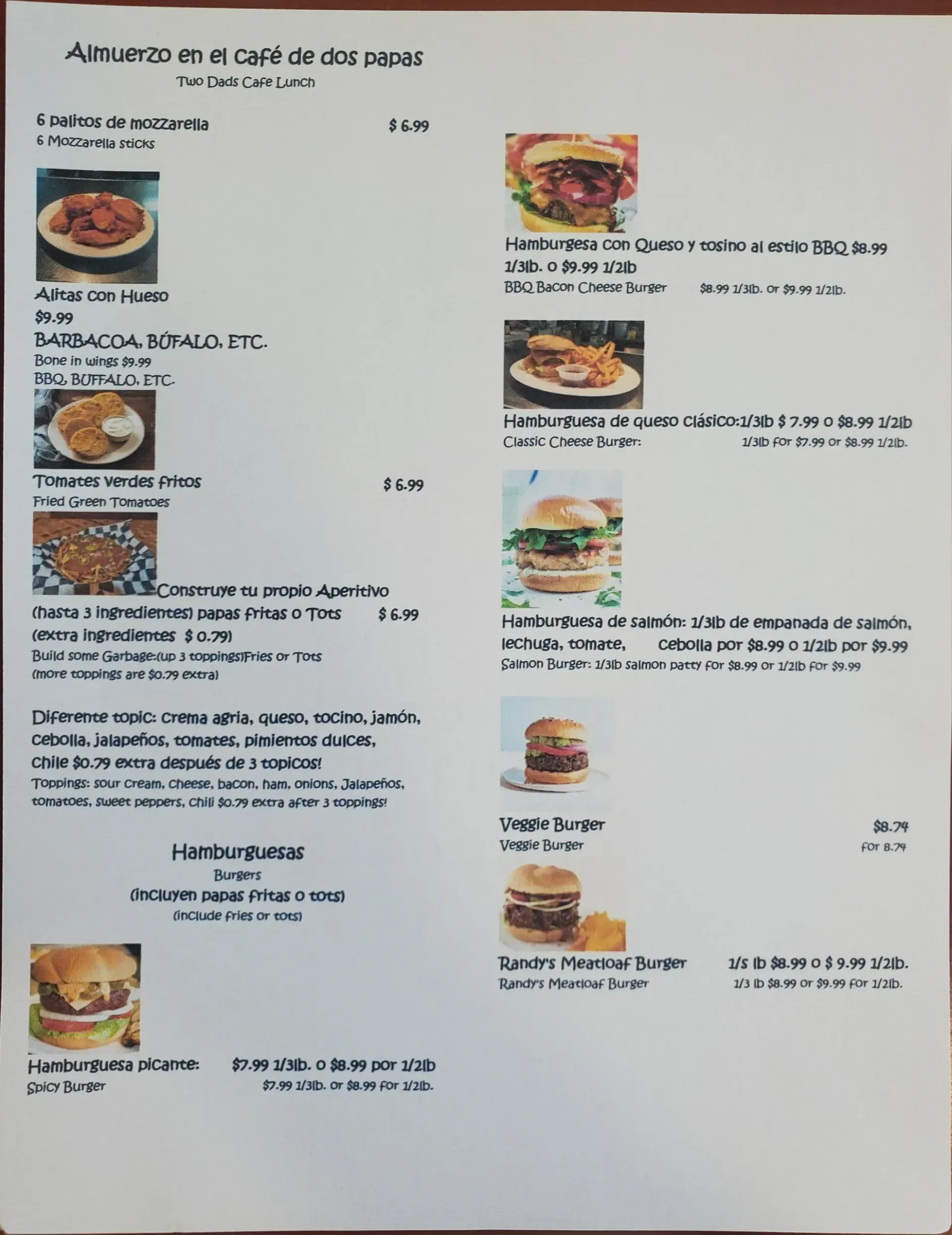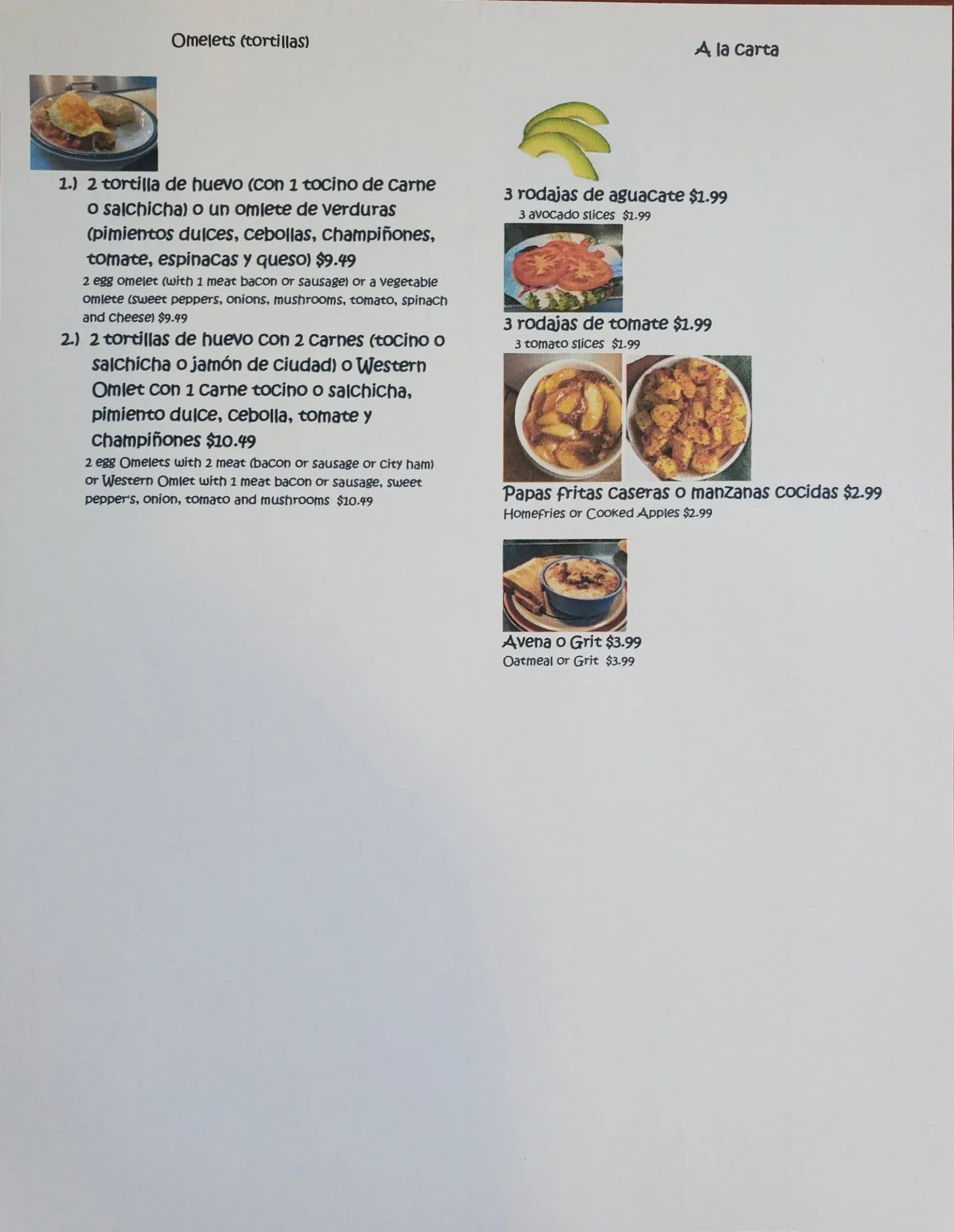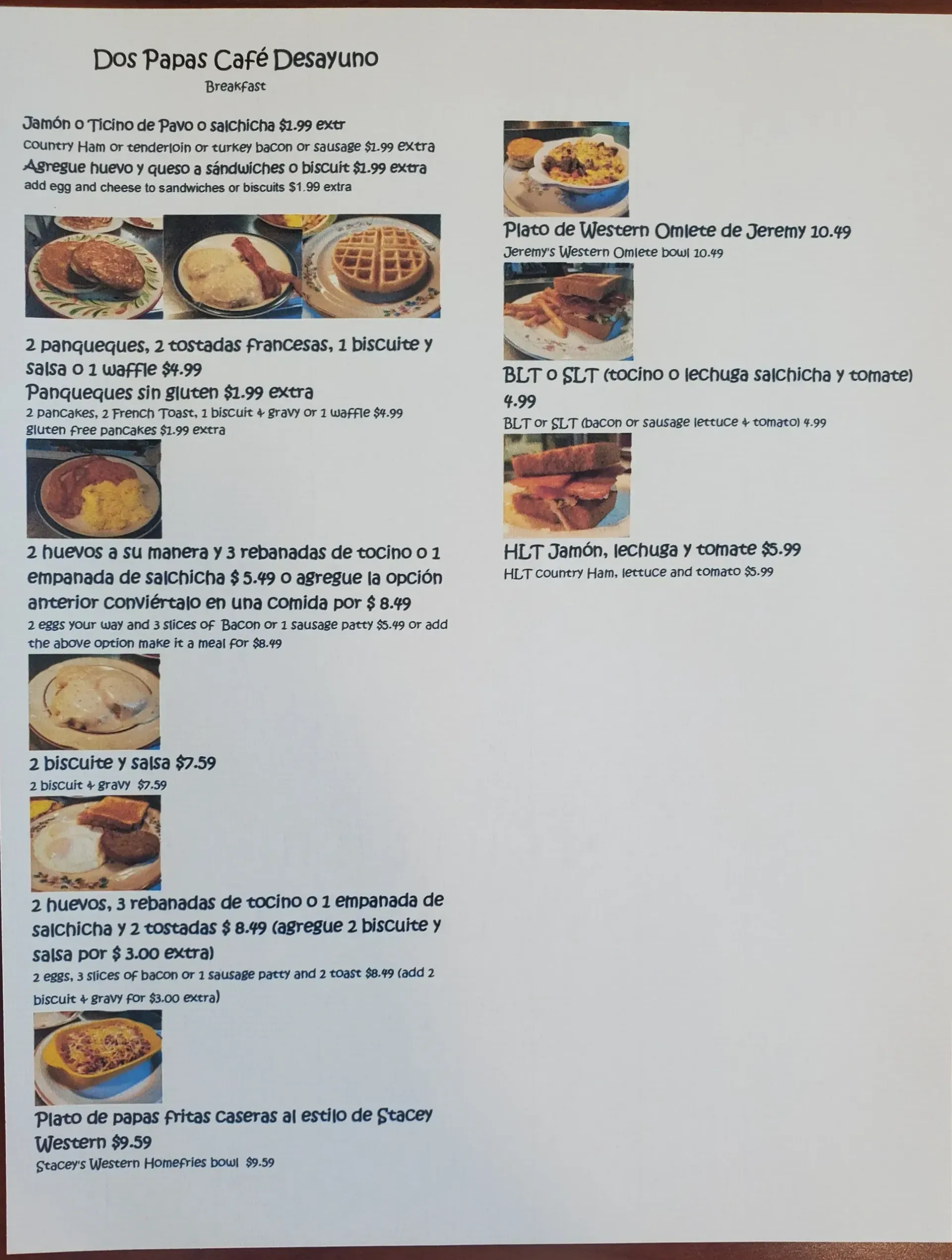 la parrilla, filete frito o pollo del país, panqueque, y más!) yunos Biscuit Sureños y salsa, huevos (a su manera, tocino, salchicha, lomo, jamón campestre, so horno, hamburguesas, hamburguesas de queso, pastel de carne, sopa de frijoles, papas al horno, Hamburguesasrs,